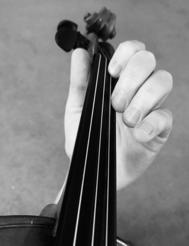 Example 4. Violinist’s hand frame for the first quadruple-stop (m. 13, downbeat). Note the open, relaxed position of the left hand.