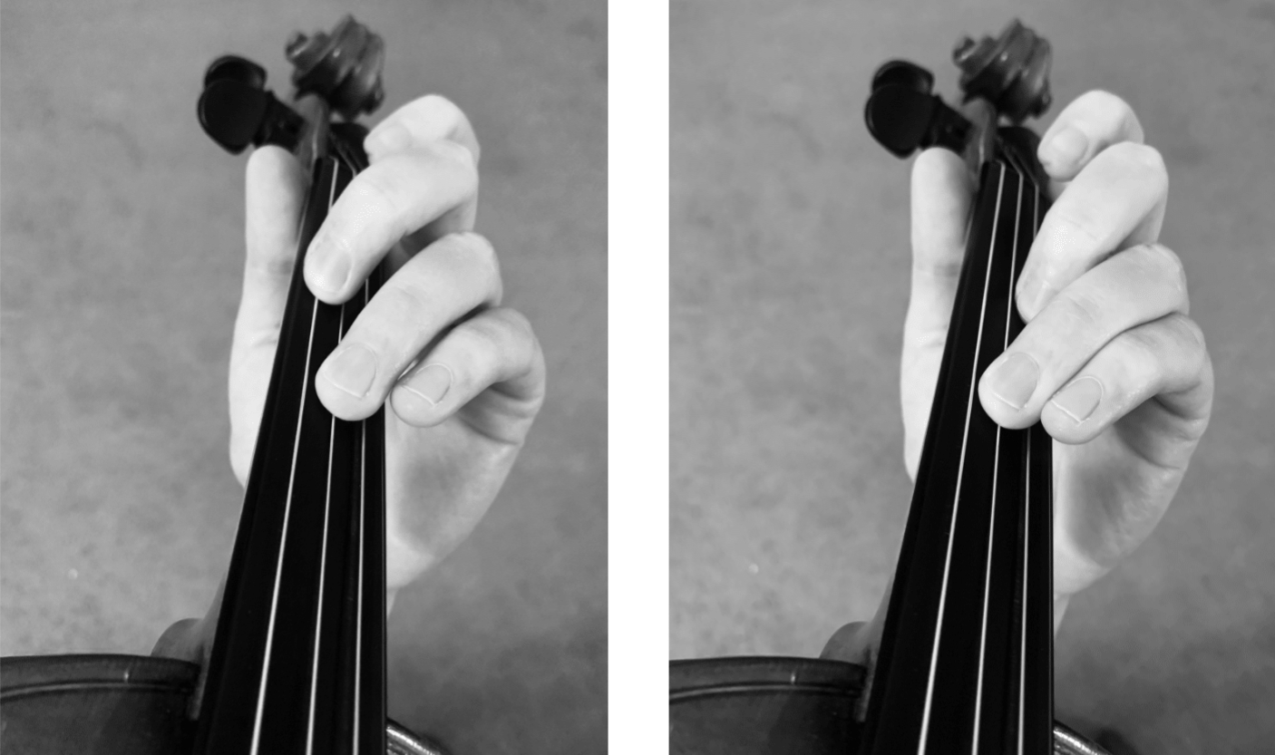 Example 6. Violinist’s hand frame for the second quadruple stop (m. 16, downbeat). The player’s second finger “hops” from the G string to the A string in the middle of the chord.