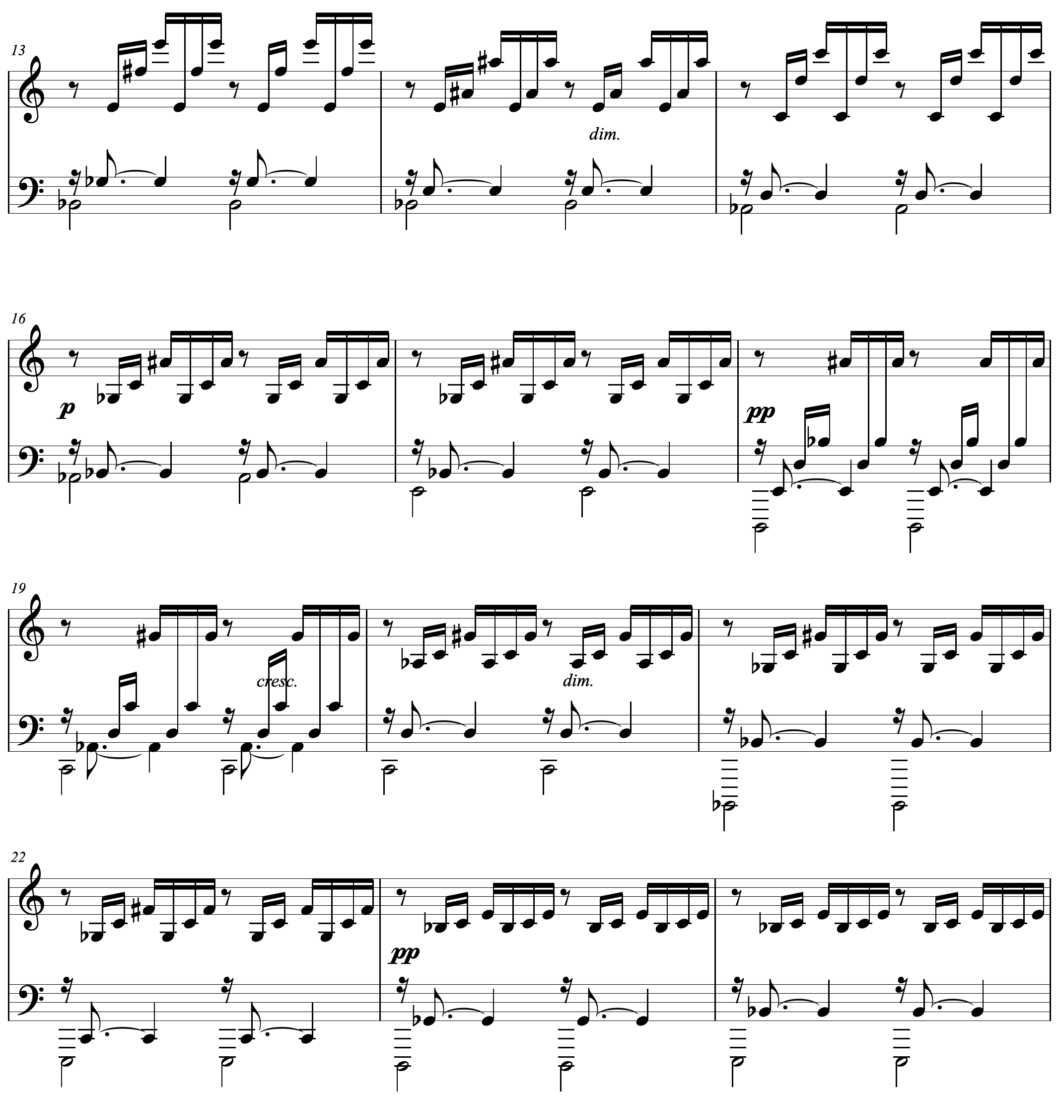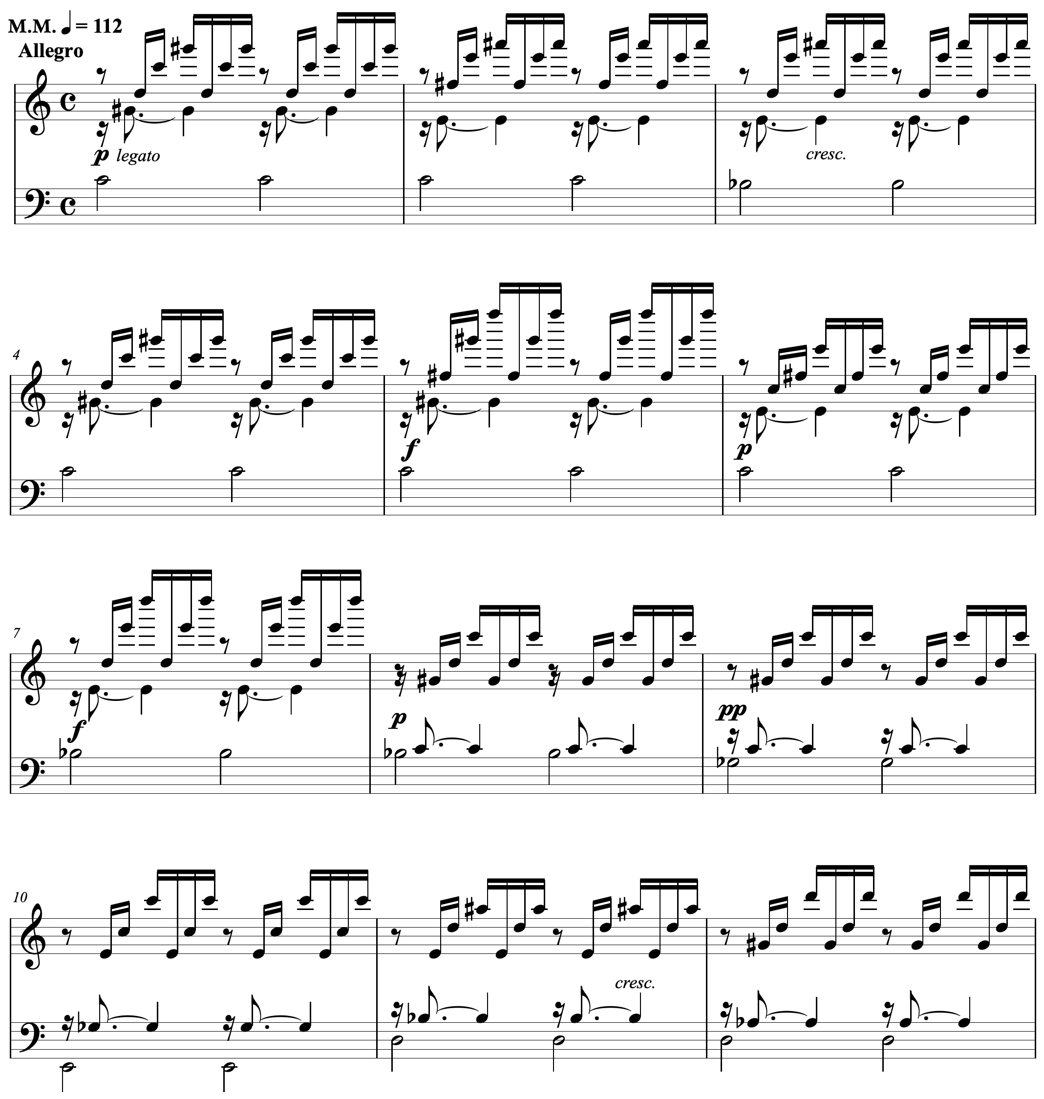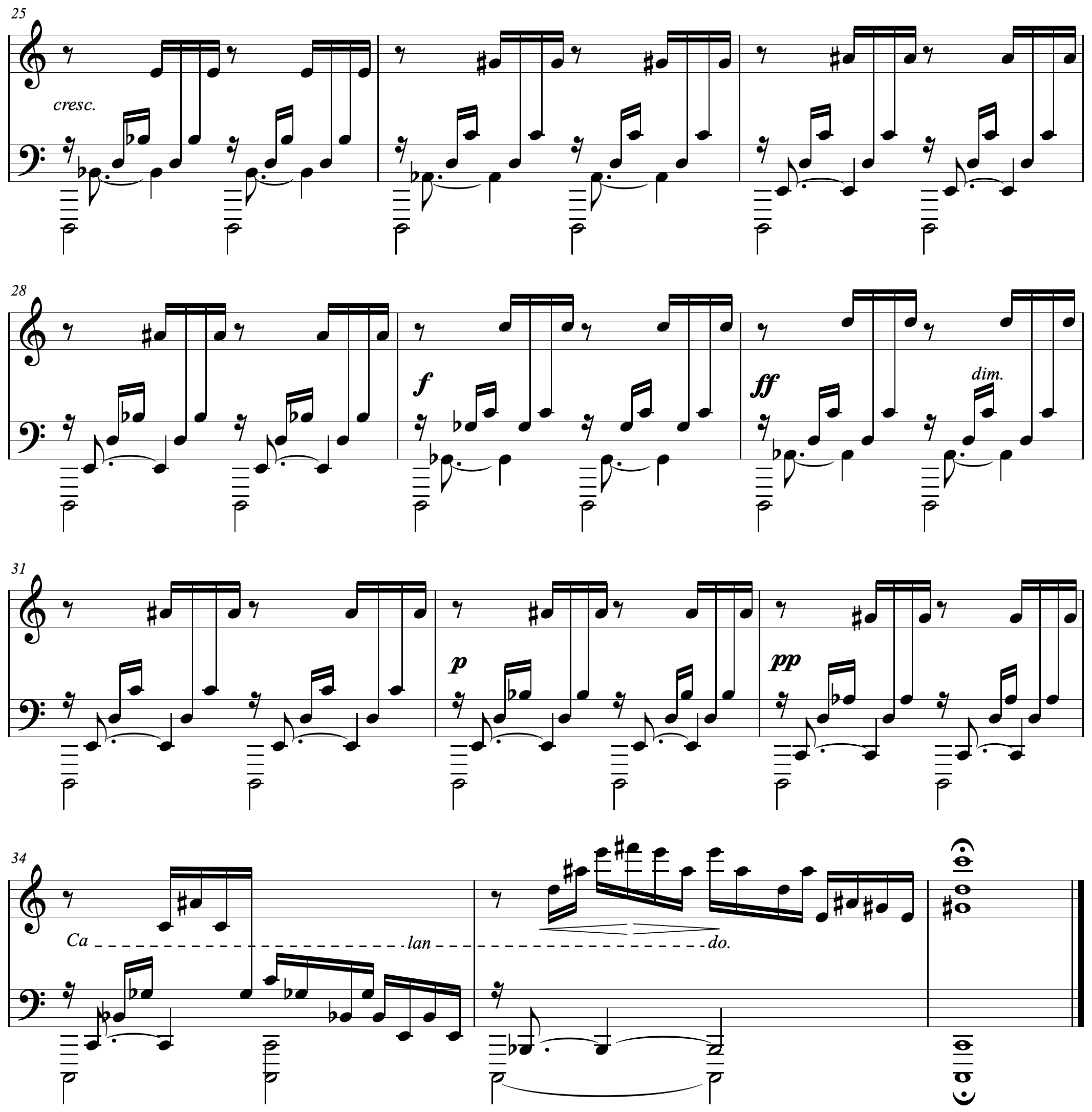 Example 16. Carrillo’s metamorphosis to the double of Johann Sebastian Bach, Prelude in C Major, BWV 846; after Leyes, 23–25. In Carrillo’s original, what should be Es in m. 23 are misprinted as Fs; I correct this mistake below for clarity. In the accompanying audio, I play the opening measures of Bach’s Prelude, as originally notated, on Carrillo’s whole-tone piano. Recorded by me at the Centro Julián Carrillo, San Luis Potosí