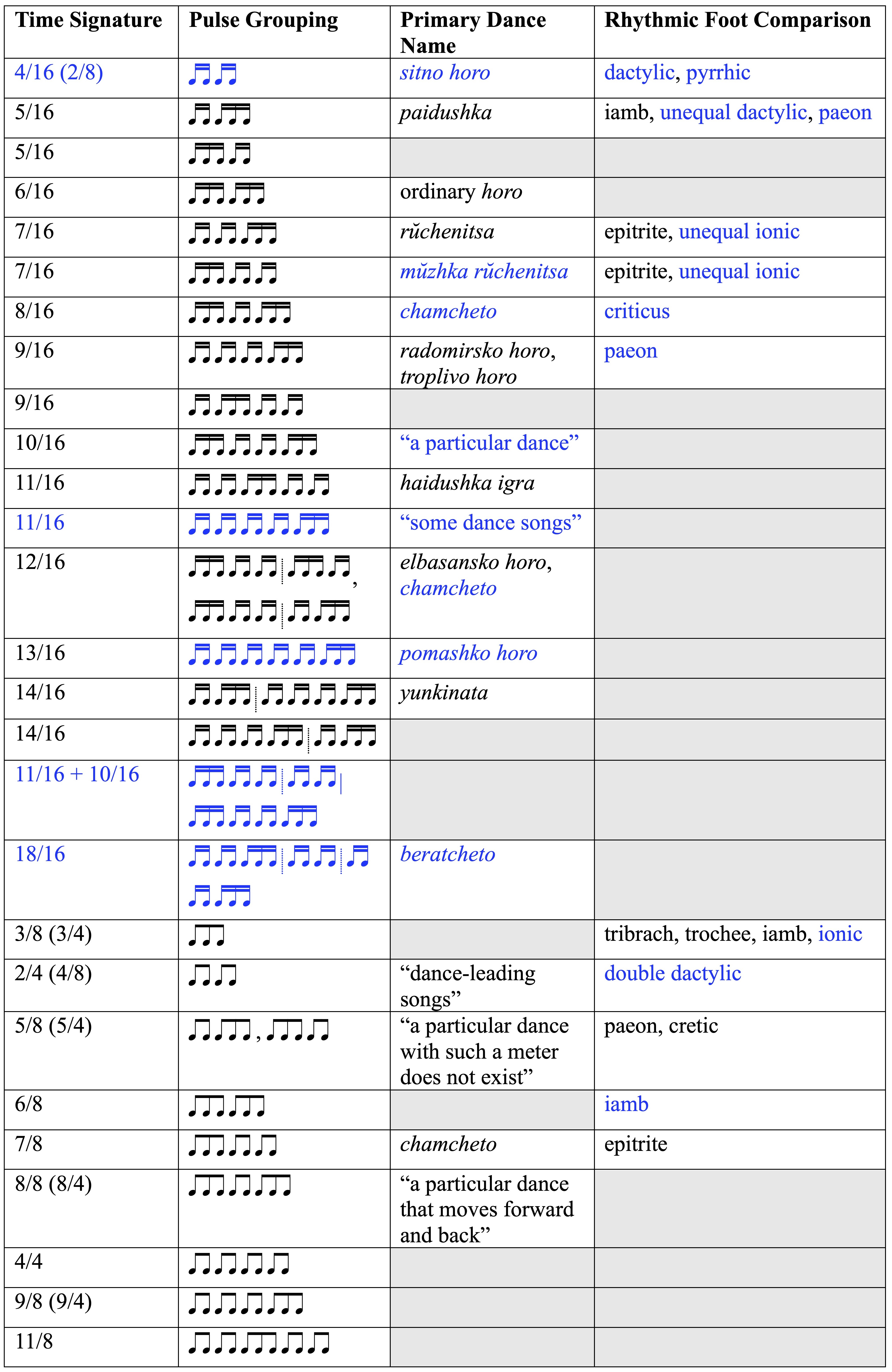 Example 12. Meters in the 1925 version of Hristov’s study and the names of the rhythmic feet he compares them to. Additions and changes in the revised version of the text are shown in blue.