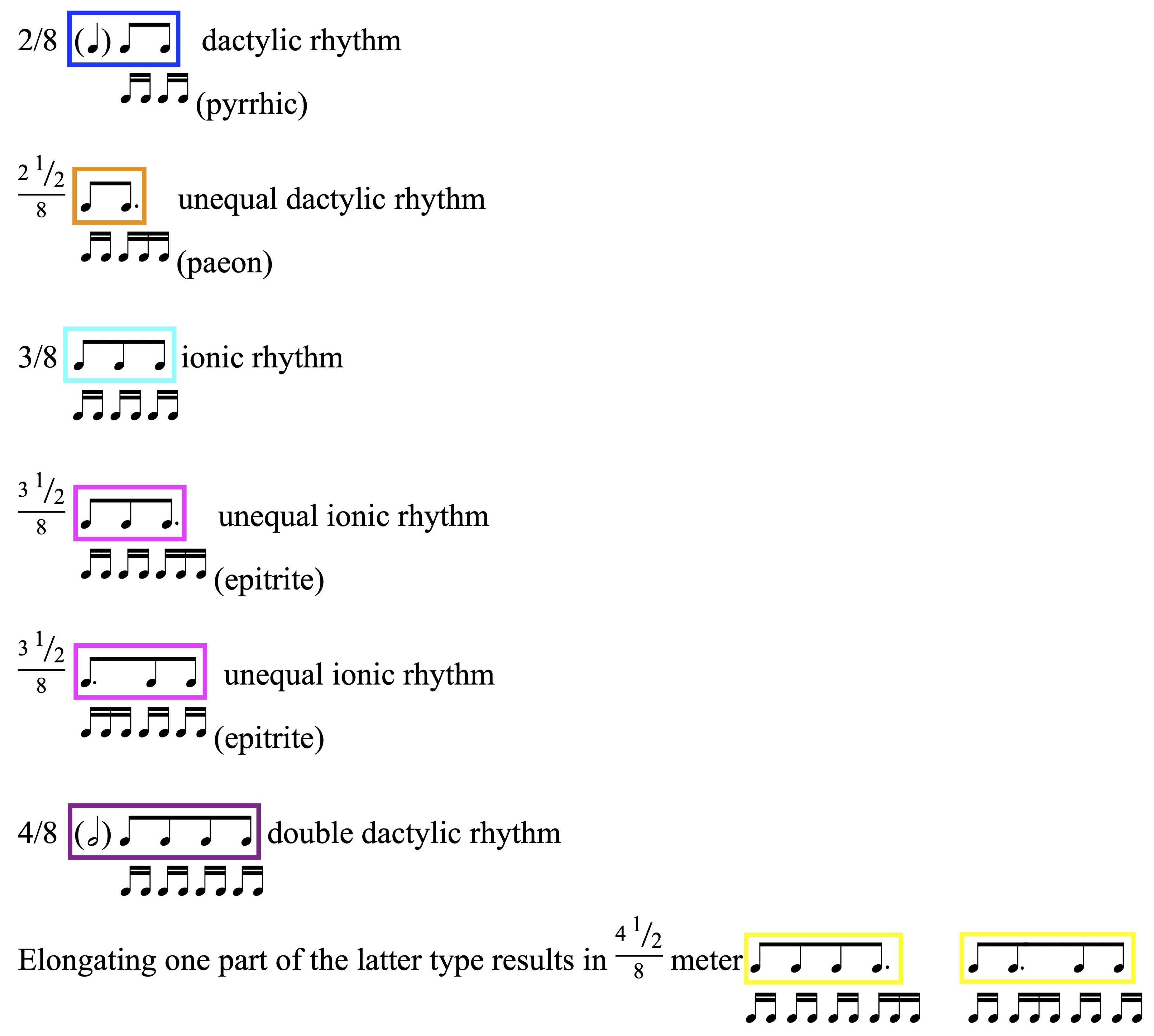 Example 14. Hristov’s ([1925a] 1967, 40–41) list of meters and corresponding names of rhythmic feet. Fractions represent time signatures. Color-coded boxes indicate correspondences with Westphal’s table in Example 13.