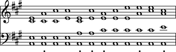 [3] Consider the specific example of a complete 4-voice root-position A-major triad. This triad has twelve possible configurations of PCs and voices, as shown in Figure 4.2.1a. Of those, there are six configurations that double the PC in the bass, but only three that double each of the other two PCs.