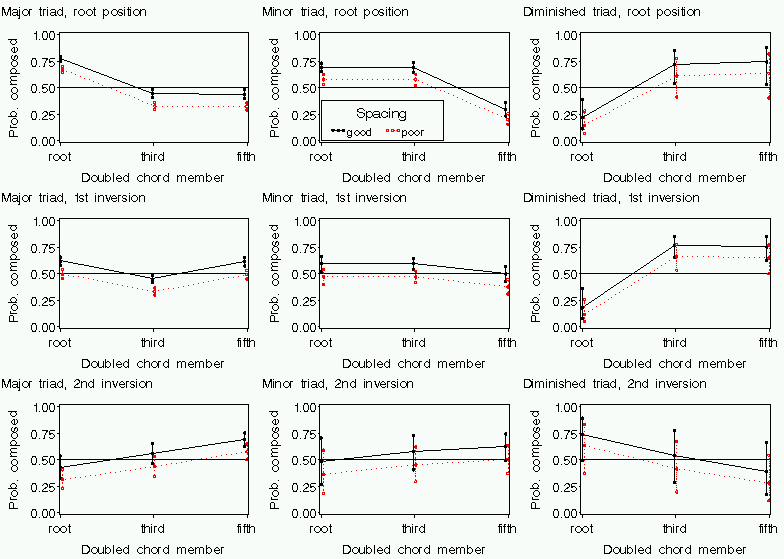[2] The upper left panel, for example, shows probabilities for a major root-position triad. If such a triad doubles the root and is well-spaced, there is a 75%-79% probability that it is composed. If the triad doubles the root and is poorly spaced (red), its probability of being composed is lower (64%-70%), but still greater than 50%. In sum, the panel suggests that Bach, Haydn, and Mozart favored doubling the root of major root-position triads.