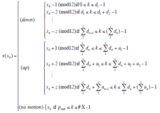 [8] P-matrices can be defined formally by invoking the surjective τ function from Example 1, thus allowing for “fusing” (and, indirectly, “splitting”) as introduced by Callender 1998. Definition 1 presents such a construction in which a chord X is greater than or equal to another chord Y in size, τ maps each pc in X to each pc in Y, and P indexes downward motion with the bottom row of the matrix and upward motion with the top row.(5) Though this definition is limited to voice leading involving only one or two semitones, it can straightforwardly be extended to accommodate all sizes of voice-leading moves by expanding P into a 2 × z matrix, where the largest move is the size of z semitones. This generalized definition of voice leading is given as an Appendix and is not needed for the present purposes.