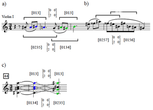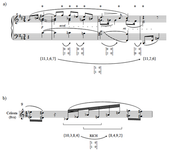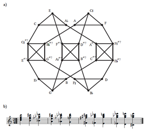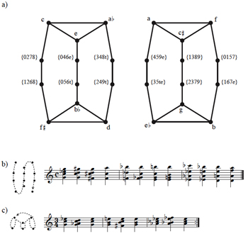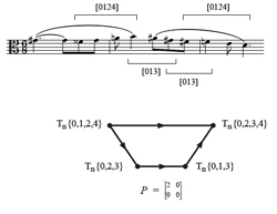 (click to enlarge) Example 16. Slice of graph for X∈[0124], Y∈[013], P = (click to enlarge) Example 17. Opening of Bartók’s Sixth String Quartet (click to enlarge) Example 18. a) Graph for X∈[0247], Y∈[037], P = |