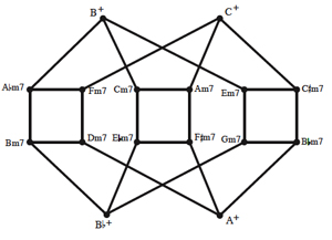 [25] Another possibility for a birdcage graph would invoke the minor seventh chord’s abilities to move parsimoniously among its members. The resulting graph connects these seventh chords with augmented triads, though it is technically not a birdcage graph since there are no two augmented triads that can be related by P. Example 12 illustrates this graph, which has fewer edges and vertices in part because of the symmetry of its pcsets: augmented chords have only four unique transpositions, while the inversionally invariant minor sevenths (unlike dominant and half-diminished 7ths) are not related to fully diminished seventh chords by a semitone, resulting in fewer P connections to other members of their own set class.