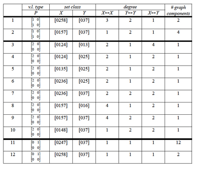 12. In graph-theoretic terms, this is not a proper coloring because two or more edges of the same color are adjacent to one another for the intra-cardinality cases. The familiar problem in graph theory of finding minimal edge colorings is thus similar but not identical to the question of finding unique voice-leading types within a voice-leading graph.
