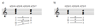 [6] In a footnote to their investigation of parsimonious graphs, Jack Douthett and Peter Steinbach suggest a way in which their relation definition might be extended to accommodate pcsets of different sizes: motion from a larger pcset to a smaller one can be modeled as a “surjective” or “onto” map acting on each of the pitch classes in the larger set (Douthett and Steinbach 1998, 261). Example 1 illustrates the idea of such a model for two cases. In Example 1a, τ is the function moving G,B,D, and F to G,C,C, and E, respectively. This function contains no inverse: there is no single-valued way of moving the C major chord to the G7 chord, since the pitch class C splits into two other pitch classes. In Example 1b, however, the function τ′ does have an inverse since the two pcsets have the same cardinality. The function is thus not just a surjection or “onto” mapping but a bijection, i.e., a mapping that is both “one to one” and “onto.”