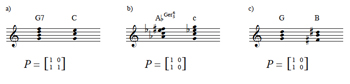 [9] The present voice-leading model, as illustrated by the first two examples and formalized in Definition 1, warrants two observations. First, P-matrices are not unique to a given harmonic progression, since the voice leading can occur in a number of different ways. It is convenient to assume that the voice leading is as smooth as possible; that is, each voice in chord X moves to the nearest pc in chord Y.(6) Given this constraint, P will still not necessarily be unique for any given progression (e.g., P for Example 2a could also be given as
