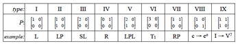 [11] As yet we have not accounted for motion from a smaller pcset to a larger one; since P involves the opposite scenario such motion is given by the “mirror” of P as given in Definition 2. A result of Def. 2 is that the relation given by P is non-commutative, since X P Y implies Y (MIR(P)) X. Furthermore, if a given nonzero P is the same as its mirror, some type of contrary motion is at work.(10) Definition 2: For P = [12] With the voice-leading definitions now in place, various types of voice-leading parsimony can be explored, nine of which are proposed in Example 4. These types correspond to all P-matrices in which the total voice leading is equivalent to three semitones or less. There is also one addition, type IX, which corresponds to the smoothest voice leading involved in a move between a tonic major triad and its dominant-seventh chord (Examples 1a and 2a). Though this sort of motion is not especially parsimonious, strictly speaking, this voice-leading type appears in this study due to its frequency in the musical literature. The mirrors of each matrix in Example 4 are not included in the list, since they are grouped as part of the same voice-leading type. This consideration follows from the fact that common transformations correspond to both a P-matrix and its mirror; e.g., the L-transformation is represented by either