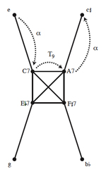 [16] The birdcage graph of Example 6 gains particular relevance when we use it to model the “omnibus” progression of the type explored by the theorist Georg Vogler around the turn of the nineteenth century.(14) There are a number of ways of discerning a group structure from the graph, most of which involve combining the cardinality-changing transformation with some of the known groups that act on triads and seventh chords.(15) For the present purposes, though, we will restrict ourselves to the cardinality-changing P-matrix transformation discussed above, labeled here as α, along with transposition. As Example 8 illustrates, beginning with any of the minor triads and repeatedly applying an <α, T9, α> sequence of transformations induces one of three possible “omnibus subgraphs,” around which the omnibus progression follows a clockwise path.