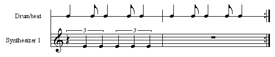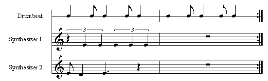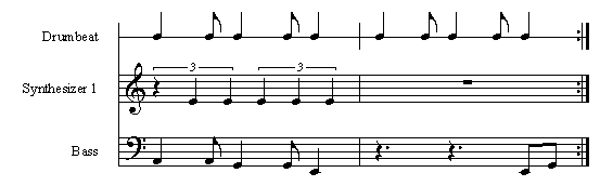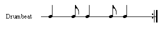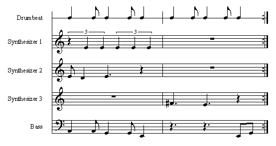 The following excerpts show most of the patterns that occur in "Compression." They proceed in order from the solo drumbeat that begins the song to a texturally dense passage in the middle. The listener should follow parts a through e down the page as the audio file plays; there are pauses after parts b, c, and d. Please note that some passages have been omitted for the sake of concision.