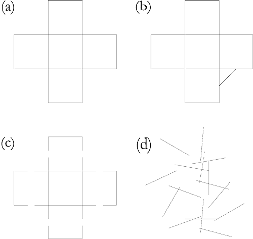 Example 4. Coherence or chaos? (a) regular cross, (b-c) modified crosses, (d) random collection of line segments [GIF Format] | Change to DjVu |