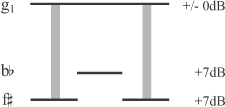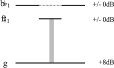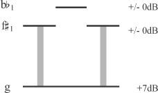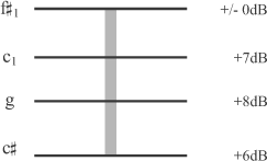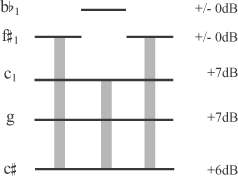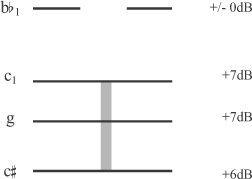 [18] In this case, it may be suggested that the G captures the F-sharp more than itcaptures the B-flat because G is closer to F-sharp than to B-flat. Butwhile this may be a factor, the parsing remains the same when the G isplaced above the other two tones. This is heard in Sound9, seen in Figure 9, and inSound 10, seen in Figure 10. (For comparison, hearFigure9 without g1; Figure 10without g1.) I can only conclude that the altered octave is responsible for the sense of integration.