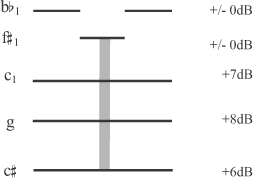 [14] Whether because of neural properties inherent in the masking orbecause the critical band coincides with intervals at which beats are maximally"rough," the critical band is associated with a dissonant "color." Thegreatest roughness occurs when one partial is near the edge of the other'scritical band. When partials are well within each other's critical band(i.e. very close in pitch), there is little roughness; it is almost asif they coincided exactly. Figure 4 gives an approximate representationof the masking involved in various intervals, with a lower tone in middletreble register such as g1. For traditional consonances suchas the M3 and P5, several partials of each tone are not masked, and manyof those that are masked are so close in frequency that they do not producesensory dissonance. The augmented 4th presents little more masking thanthese consonances, but a greater degree of roughness. In the minor 2nd,masking and dissonance are both high. It is difficult to hear the two complextones separately from each other.