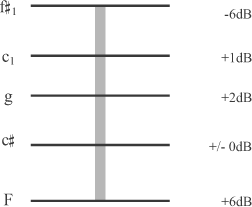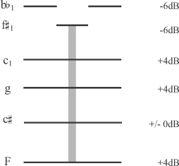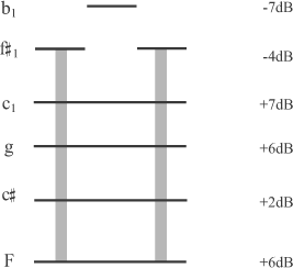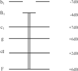 [23] Altered-octave masking accounts for the integration of the F-sharp, but other phenomena such as registral distance play roles as well. B-flat stands out partly because it is in a much higher register than all of the other tones, and if it is replaced in the sonority by B-natural as in Figure 15, the B-natural stands out at least as much. The increased interval--F-sharp- B-flat to F-sharp - B-natural--increases the tendency for stream segregation,making the B-natural stand out, despite that the B-natural forms an alteredoctave with the C-natural.