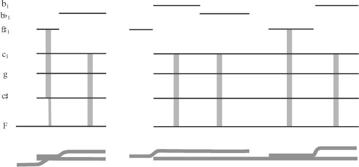 [24] The informal experiments just discussed suggest that it should be possible to perform the passage in such a way as to bring out the connections shown in Figure 16. Belowthe analysis I have given a drawing showing each sound-object as a lineor stream. Separate streams are represented by separate lines, and integratedsounds are represented by single or touching lines. As the figure shows,when the three upper instruments enter, the cello's F may at first be heardseparately, but as the chord is held the F-sharp blends in, changing thetimbre emerging from the chord. The violin moves to B-flat, again splittingthe mixture into two sonorities. The next gesture begins with the F-sharpalone in the violin (mirroring the cello's earlier isolated low F). Whenthe other instruments join, the violin stays in its own stream. In thefinal gesture, the violin again begins as part of the underlying sonority,moving later to B. At actual tempo, these streams are not clear-cut, butthey represent a subtle partitioning in the harmonic stream. A particularlynuanced performance might even succeed in using the F-sharp to establishthe first violin in a blend that is maintained even when the violin changespitch, so that the violin's motion to B-flat and B produces a change incolor of the continuous sonority, not a splitting of the sonority.