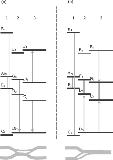 [26] If the outer voices are played loudly enough, they mask the inner voices of chord 3, as in Figure 17a (where vertical lines with arrows indicatethat the inner voices seem to "belong" to the outer voices). Because eachinner voice is masked by a different outer voice, the inner voices' ownintegration is minimized. (Sound 17a(i);the effect is strengthened further in Sound 17a(ii).) Chord 3 will then consist of two sonorities. (The decreasing integration is indicated by the thicker vertical line in chord 1, the thinner line in chord 2, and the line's disappearance in chord 3.) On the other hand, if the outer voices are quieter, they are masked by the inner voices, as in Figure 17b. The altered-octave shimmer steadily accruing to the innervoices adds to the evolving color of the inner voices' own integration.Thus, the inner voices of chord 1 are heard as simply a major third (withthe outer voices forming their own, separate, sonority). As the inner voicesmove to chord 2, a new color emerges not only because the inner voicesnow form a perfect fourth but also because this pair of tones is now coloredby the altered octave of the lowest voice. Finally, the color of the augmentedfourth of chord 3 is enhanced as a second altered octave is contributedby the highest voice. (Hear this effect in Sound17b(i), and more strongly in Sound17b(ii).)