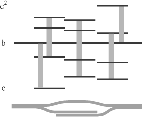 [27] Parallel motion between tones increases their fusion. Composersseem to find this principle useful for increasing the perceptual coherenceof sonorities with a moderate but not overwhelming tendency to fuse. Thus,in both common-practice and early atonal music, major and minor thirdsfrequently appear in parallel motion; and altered octaves often appearin parallel motion in early atonal music. In Webern's orchestral piece op. 6, no. 1, mm. 2-4 (Example 3 [GIF] [Scorch]), parallel motion fuses the top threetones of the first two tetrachords; in the second chord an altered octave captures the bottom tone as well; and parallel motion fuses the bottom three tones of the third chord. As is shown in Figure 18a, this leavesa low C and a high C free, and in Sound18a these tones stand out. But the Cs are not entirely free; theyform altered octaves with the B of the French horn, as shown in Figure18b (hearSound 18b(i) orSound18b(ii) with simultaneous onset of horn and cellos). In the demonstrations,the Cs are less prominent when the horn's B is sounding than when it isnot--another way of saying that the Cs start and end as colorations ofthe B, flowing from the B into the stream of chords and back. During thesethree chords, altered octaves are the key to associative relationshipsin which the melodic lines "split, double, multiply, dissolve, condense,float apart, coalesce" like characters in a Strindberg dream play.