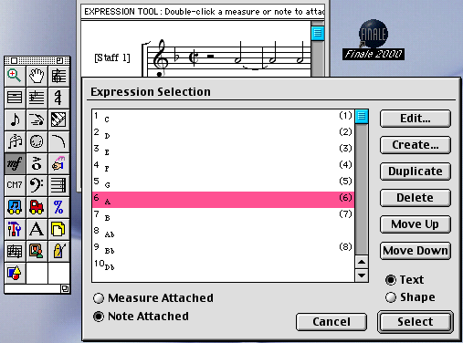 Figure 6. Expression Selection window (Finale 2000)