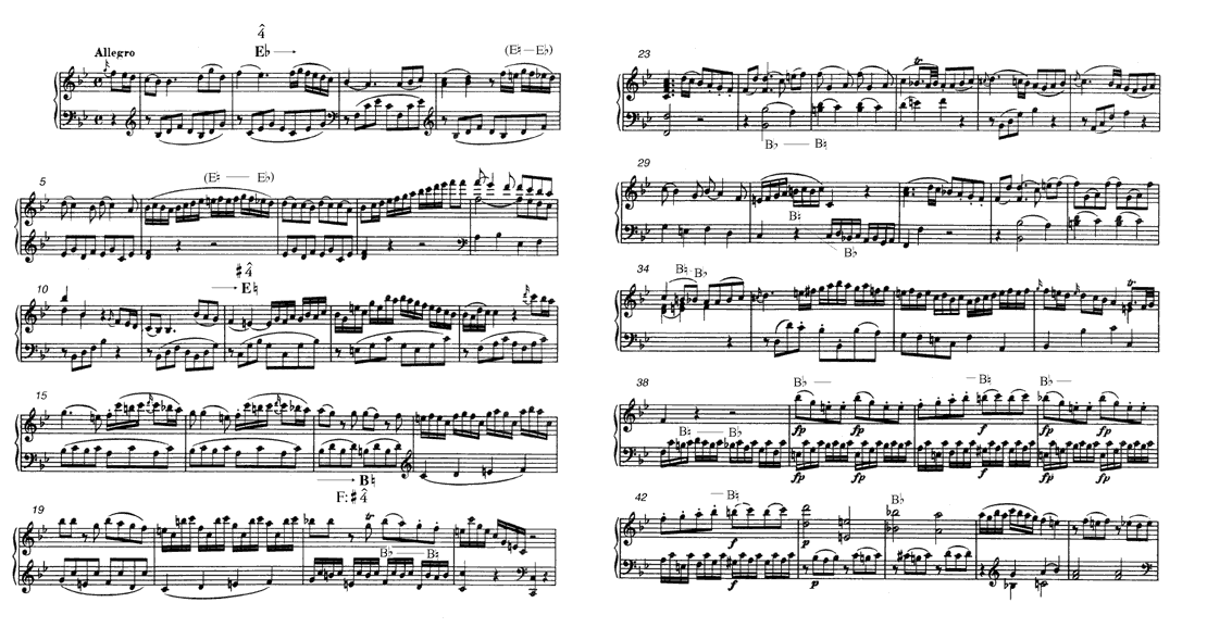 Example 1. Mozart, Piano Sonata in B-flat major, K. 333, I, exposition, mm. 1-46, score with annotations [GIF format] | Change to DjVu |