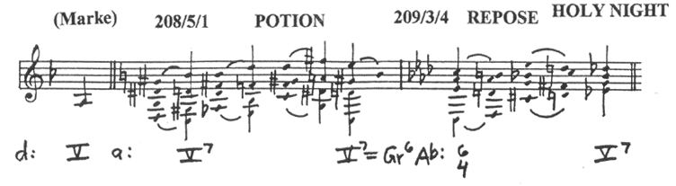 | Example 10. Tristan's reply to Marke (Act II, Scene 3) represents the first group of memory recollections. While the text chronicles his external response to the king and inquires to Isolde, the music reveals Tristan's true internal state of mind, which continues to dwell on memories evoked by immediately preceding Love Duets. This section features a quasi-strophic design, in which the Introduction later functions as a Refrain in Strophes 2 and 3. The three strophes are tonally closed in Ab, effecting a tritone shift from Marke's prior D-minor referential center. |