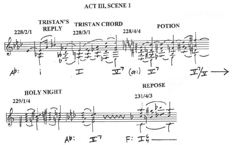 | Example 11. Tristan's vague and imprecise recollections of Isolde and their "night of love" as he awakes from his sick bed (Act III, Scene 1), and the distorted rhythmic settings of the Duet motifs as he feverishly awaits Isolde's arrival and entry (Scene 2) |