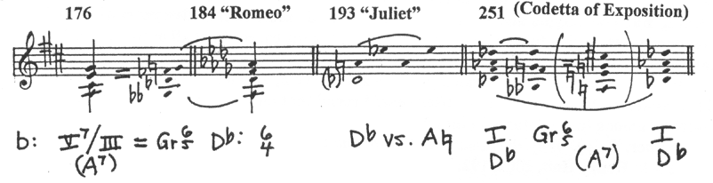 | Example 4. The use of Balakirev's suggested Db major for the pair of "Romeo and Juliet's themes" in the secondary area of that Overture Fantasy (1869), with implications of Artôt's acronym Db - A (enharmonic German sixth). This key also appears in "The Letter Scene" (Eugene Onegin 1877) with the same bVI emphasis, as well as the famous "None but the Lonely Heart" No. 6 of Op. 6 (1869), a song cycle dedicated to Artôt. |