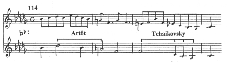 | b. | Unusual use (for Tchaikovsky) of a Russian folk song ("Oy, Kryatsche, Kryatsche") as the principal theme. -- His rationale for choosing this melody may be its disguised references to both his and Artôt's acronyms: |