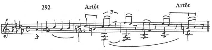 | d. | The strange absence of the piano during the lengthy first section of the development. -- This section focuses on an gradual intensification of the previous "reminiscence" theme (note allusions to Artôt's Db - A), possibly portraying their own deepening romantic involvement. Its climax prepares the dramatic double-octave entry of the soloist. |
