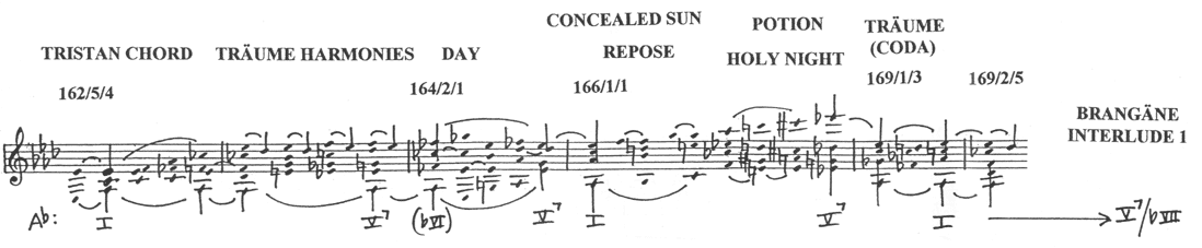 | Example 9. Motivic and tonal summary of the Love Duet complex in Act II, Scene 2 of Tristan und Isolde, which will furnish the basis for the subsequent "recollection of memories" sections during the following scene and in Act III. The key of Ab major forms the referential center for the three duets, which are linked by similar material. The music shifts to B major during the final duet, whose climax is interrupted by the intrusion of Marke's entourage. |