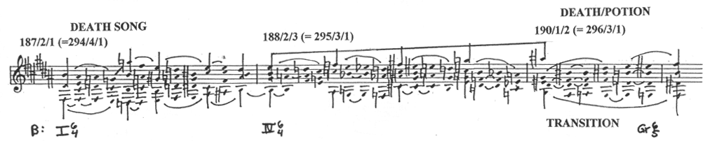 | Example 9. Motivic and tonal summary of the Love Duet complex in Act II, Scene 2 of Tristan und Isolde, which will furnish the basis for the subsequent "recollection of memories" sections during the following scene and in Act III. The key of Ab major forms the referential center for the three duets, which are linked by similar material. The music shifts to B major during the final duet, whose climax is interrupted by the intrusion of Marke's entourage. |
