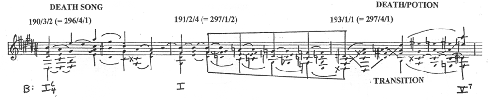| Example 9. Motivic and tonal summary of the Love Duet complex in Act II, Scene 2 of Tristan und Isolde, which will furnish the basis for the subsequent "recollection of memories" sections during the following scene and in Act III. The key of Ab major forms the referential center for the three duets, which are linked by similar material. The music shifts to B major during the final duet, whose climax is interrupted by the intrusion of Marke's entourage. |