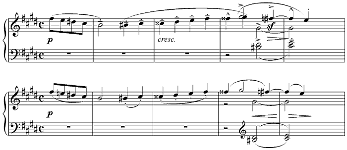 Riemann, from his vantage point, would not only deny that such notational idiosyncrasies were access points, but also would maintain that even conventional notation blocked access to the contents, which in any case were not to be found in the autograph, but in the mind of the listener (with the composer being the original listener). His mission, when editing works, was to represent the proper relation of the published work to the actual, law-abiding original. His editorial interventions were thus analytic acts, designed to show the conformity of the artwork to the laws of phrasing and dynamics. The treatment of the second theme of op. 14, no. 1, first movement perfectly illustrates his methodology. The top staves are Riemann's, and the bottom are Schenker's.