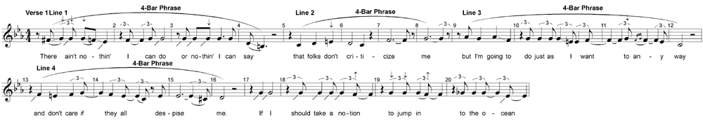 Example 1b. Vocal transcription: Bessie Smith's Verse 1 and Refrain of "'Tain't Nobody's Biz-ness If I Do," recorded 1923 (Columbia)