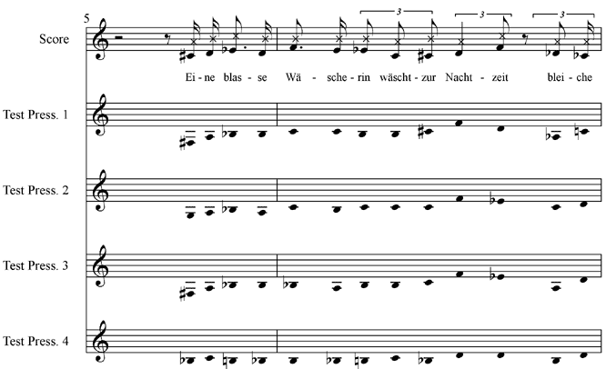 Figure 1. Comparison of Sprechstimme in the four test pressings of "Eine blasse Wäscherin"