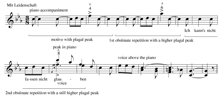 Example 11. Schumann, Frauenliebe und Leben, Op. 42. No. 3: "Ich kann's nicht fassen," mm. 64-86, annotated melodic line [GIF format] | Change to DjVu |