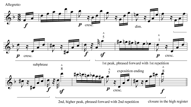 a) A passage with growing obstinacy in the exposition: mm. 16-31, annotated melodic line