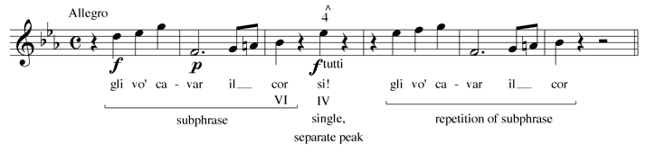 Example 3. Mozart, Don Giovanni, K. 527. No. 3: "Ah! Chi mi dice mai!" (Dona Elvira), mm. 50-55, annotated melodic line [GIF format] | Change to DjVu |