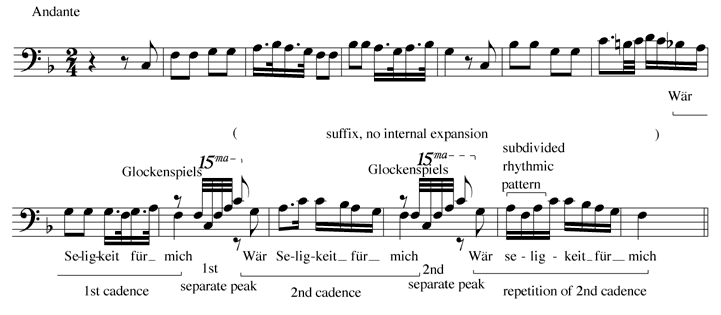 Example 4. Mozart, Die Zauberflöte, K. 620. No. 20: "Ein Mädchen oder Weibchen" (Papageno), annotated melodic line [GIF format] | Change to DjVu |