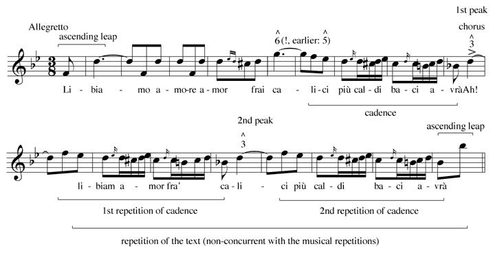 Example 5. Verdi, La Traviata, Act 1. "Libiamo, Libiamo, ne' lieti calici," mm. 60-76, annotated melodic line [GIF format] | Change to DjVu |