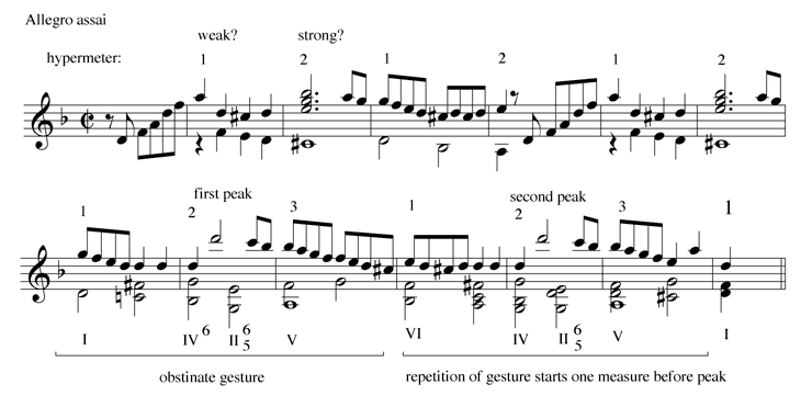 Example 7. Mozart, Piano Concerto K. 466, 3rd movement, mm. 1-13, annotated melodic line [GIF format] | Change to DjVu |