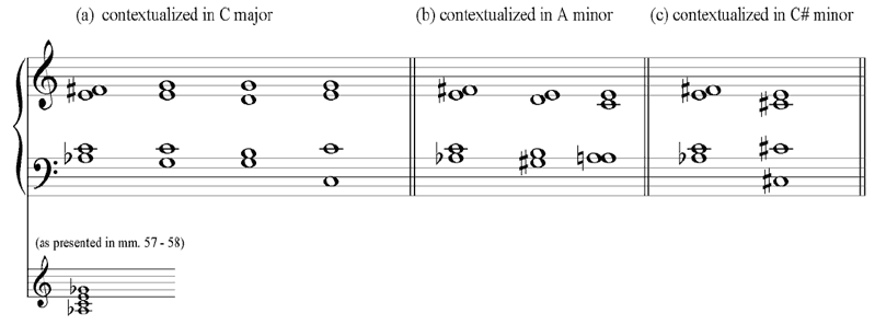 Example 12. The sonority of mm. 57–58 in the “Prélude,” contextualized