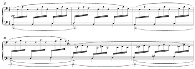 A short-lived Classical-era vignette appears in mm. 13–20. It is based upon a descending major scale featuring a bright tone, and the establishment of a light mood—all of which is supplanted after m. 21, and from m. 26 a near daemonic sequential passage takes hold, a passage inconceivable in the days of Bach or Beethoven—or perhaps better, in the days of Couperin or Berlioz.(30) |