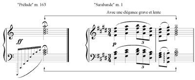 33. Howat 1985, XVII-XVIII, and XX-XXI lays out the compositional history of the “Sarabande” in some detail. In addition to the back-to-back half-diminished sevenths in m. 1, the third chord in the 1894 “Sarabande” (written seven years before the Suite�s publication in 1901) contains a D natural in the place of the D