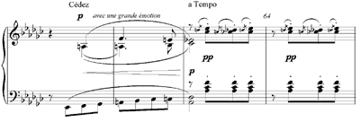 42. With respect to my earlier allusion to Bloom�s revisionary ratios, the progression outlined in Example 14(b) carries semblances of “tessera,” the second of Bloom�s six ratios. In tessera, the later poet projects the original work in the negative light of not having gone far enough, and takes an antithetical position with respect to the original work in order metaphorically to complete it [Bloom 1973, 49–76]. In Pour le piano Debussy�s progression is the antithesis of Wagner�s in that there is a temporal disruption (Debussy�s half-diminished seventh sonority is heard
