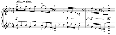 the B–F tritone (registrally accented in the left-hand piano gesture across
