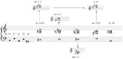 [16] The process outlined above is akin to the earlier move to B minor. But a fascinating and edifying progression occurs just in advance of m. 18 and the arrival of A major; at the point of maximum dissonance in terms of music and poetry (mm. 14–15, repeated in mm. 16–17), allusional reference is made to each of the sonorities of mm. 1–2. Example 4 will help to illustrate. The series of augmented chords in mm. 14–17 emerges at the tail end of a sequence of descending fifths (mm. 10–14). These same augmented chords either replicate, or—in a manner consistent with Lewin’s “law of the nearest way”(21)�express slick familial relationships with the three principal sonorities from the opening measures of “De rêve”; the text in mm. 14–17 is a present tense lament of a lost past: “Maintenant navrée, a jamais navrée” [Now regretting, forever regretting]. |