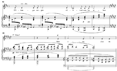[18] The foregoing argument is further substantiated from a performance standpoint, for it is telling to note that the projection of the three distinct accompanimental strata in mm. 88–91 cannot be effected as written: a subtle fissure between mm. 87–88 prohibits the lowest of the three stratum from operating in sync with the other two, and in a metaphorical sense, the bass line remains in the temporal domain of the preceding phrase. It takes pronouncement of the textual message in the vocal line following m. 89—“Mon âme c’est du rêve ancient qui t’étrient!” [My soul is of an ancient dream embracing you]—to redress the schism between strata, for once the textual message has been uttered, all participants in the setting again operate in the same temporal dimension: coming together, as it were, in the world of dream, memory, and recollection. In the end the present merges with the past in a reformational sense, without ever capitulating to that which cannot be recreated.