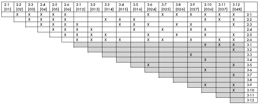 Figure 16. Trichordal and dyadic set classes that cannot be strong, positively, or negatively isographic with each other